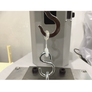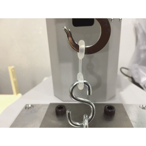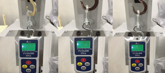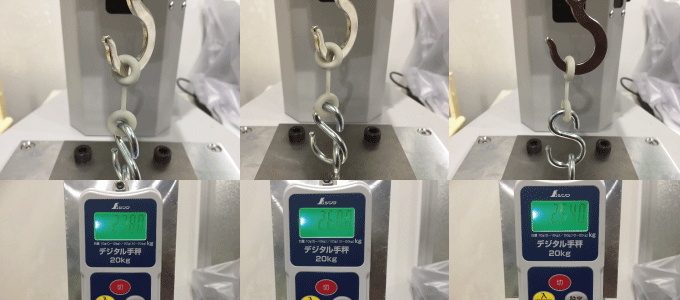 ・試験機にデジタル天秤20kgを固定し、丸管部にS字フックを引っ掛けてゴムが切れるまで引張る。ゴムが切れた時点の引張強度を測定。