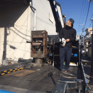 専門のゴム機械メーカー様にお願いし移設することになりましたが、重機運搬専門の運送業者様がユニックを使って慎重に成型機をトラックに積み込んでいきます。