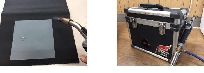 そこで、右側半分の水滴をふき取り、表面改質してみます。使用する設備はソフト99の「フレイムボンド」です。
