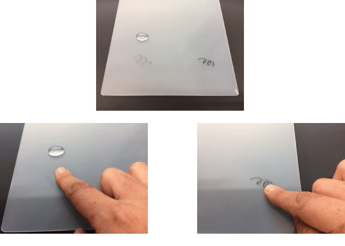 表面改質していな箇所は指で擦ると簡単に落ちますが、表面改質した箇所は指でゴシゴシ擦っても落ちません。これが表面改質の力です。