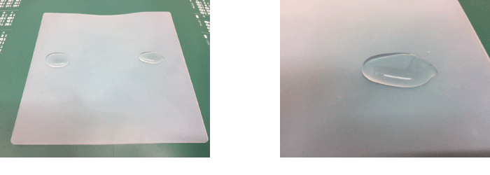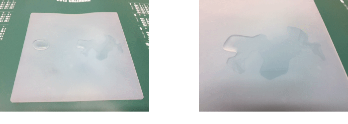表面改質していない状態のシリコンゴムシートに水を垂らすと、難接着性のシリコンゴムは撥水効果により、水は玉状になります。