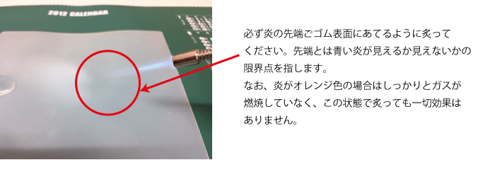 やはり前回同様に右側部だけ水玉をふき取り、ガスバーナーで炙ります。この時に注意してほしいのは、炎の先端をゴム表面に当てることです。根本や中間あたりで炙っても全く効果がありません。必ず炎の先端をゴム表面に当てるようにしてください。