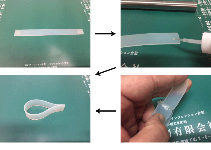 それでは、このガスバーナーで本当に接着できるのか試してみます。シリコンゴムを短冊状にカットして、両端をガスバーナーで表面改質します。改質したら、すぐに市販の瞬間接着を塗布し接着面を合わせて、1分待ちます。いかがでしょうか!!!