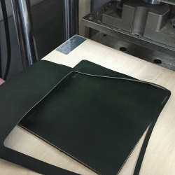 シリコンゴムのシートを抜き型と呼ばれる刃がついた型で打ち抜く事で、製品形状を形成する工法です。