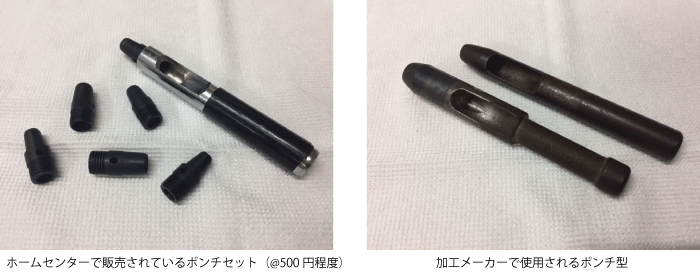 また、単純な丸型形状等は抜型の代わりにポンチと呼ばれる道具を持ちいても加工が可能です。ポンチ自体はホームセンターでも販売されておりますのでお手軽にできる加工です。なお、ホームセンターのポンチは種類が少なく、また刃が丈夫ではないので、抜き加工の際に強く叩いたり、数多く使用していると刃がダメになりますが、試作品を数個だけ製作するのであれば十分です。