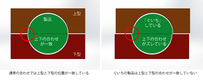「ぐいち」と言う言葉はご存知でしょうか。ほとんど成型メーカーでしか使用されない言葉ではないかと思い、少し調べてみました。語源は博打なのでしょうか・・・、ちょっと調査が足りないのであまり詳しく書きませんが、成型メーカーで使用する型の合わせ目の位置が上型と下型で一致していない状態、すなわちズレが生じている状態を「ぐいち」と呼びます。