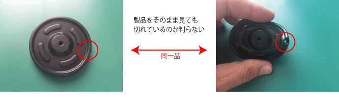 また、アンダー箇所のある製品や脱型がしづらい製品を無理に手で引っ張り脱型しようとするとゴム製品に負荷がかかり切れが発生してしまいます。仕上工程においてバリ除去のために仕上ハサミやニッパを用いる場合に誤って製品を切り込んでしまい切れ不良を発生させてしまう場合もあります。