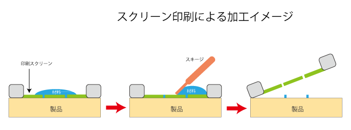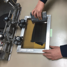 これは、文字や絵などが抜かれたシルク繊維でできたシルク版に、インクを載せ印刷させるゴムに接触させた状態でスキージでなぞる事で印刷します。