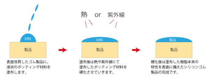 液状のシリコーンをゴム表面に塗布し表面張力にて留まらせ、熱にて硬化させる技術です。母材であるシリコーンと同素材になるので、表面改質や密着性を向上させる工程が不要であるため、他の材料と比較してコストが安くできます。