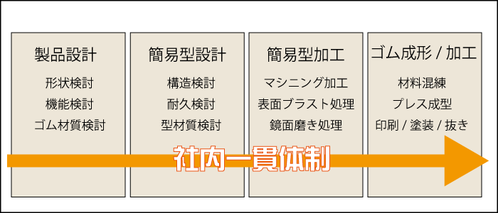 簡易型の設計から製作、簡易型を用いたゴムのプレス成型、成型品への印刷や追加工、その他の試験評価まですべての工程を社内にて一貫して対応しますので、工程間の無駄を省く事でコストを抑えてゴムの試作品を提供する事が可能です。