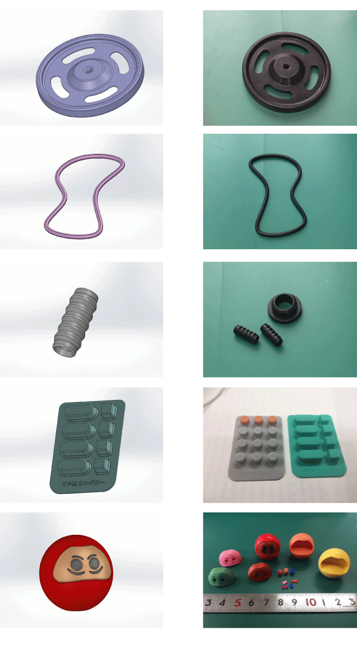 耐熱性の必要な個所へシリコンゴムやフッ素ゴム等をもちいた対応や、屋外使用用途へのEPDM素材での対応、耐油性が必要なパッキン類のNBRの選定などなど、量産品メーカーならではのゴム素材の知識をゴム試作メーカーが保有しておりますので、皆さまのゴム製品の使用用途や使用環境に合わせて最適なゴム素材を提案させて頂きます。