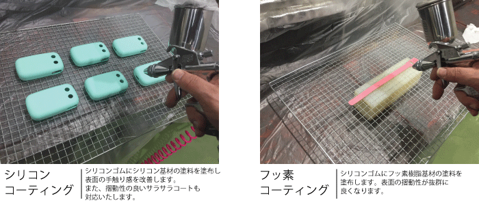 シリコーンゴム製品は印刷の保護目的やゴム表面への埃り付着対策のために、コーティングを施すことがあります。こちらも社内にて対応させて頂きますのでご相談ください。